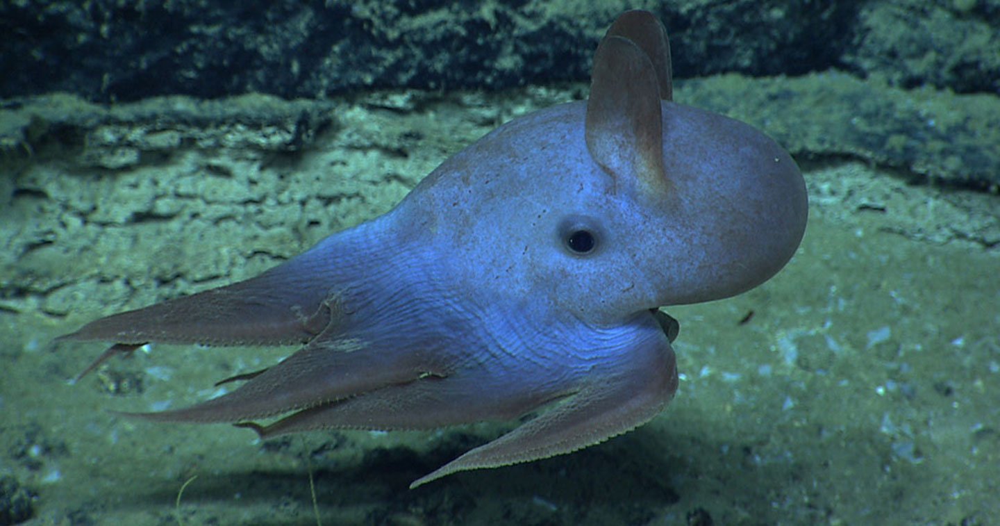 Il doit son nom au personnage Dumbo de Walt Disney car il nage avec ses oreilles. Ce poulpe vit en pleine mer, dans les abysses, entre 500 et 4000 m de profondeur. La taille moyenne de l’animal est de 20 à 30 centimètres de long.