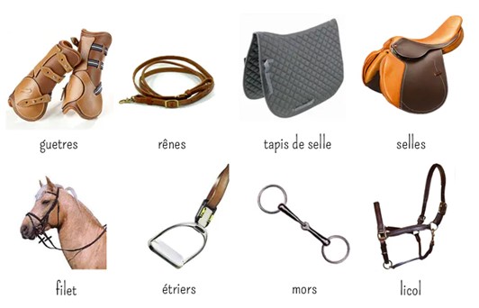 Le cheval aussi a un équipement particulier : une selle fixée par une sangle qui passe sous son ventre, un tapis  que l’on met sous la selle pour ne pas qu’elle soit en contact direct avec le cheval et qu’elle le blesse, un filet au niveau de la tête, un mors qui passe dans la bouche et qui est relié au filet, un licol que l’on met pour aller chercher le cheval dans le pré, des guêtres que l’on met aux pattes et les étriers pour les pieds du cavalier.