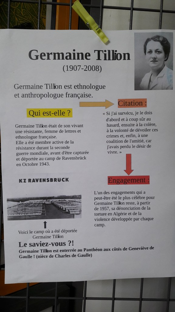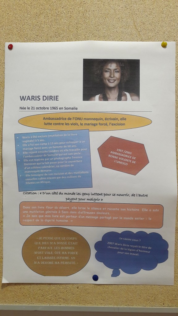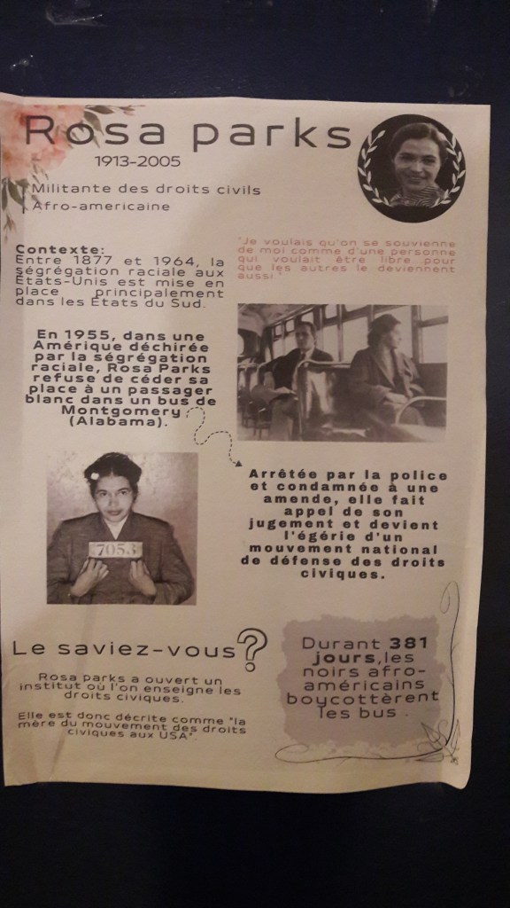 A l’occasion de la journée des droits de la femme le 8 mars, j’ai demandé à mes élèves de 3eD et 3eE de réaliser un portrait de femme ayant marqué l’Histoire afin de mettre à l’honneur des personnalités parfois méconnues du grand public. A partir d’une liste d’une soixantaine de noms, ils ont ainsi eu à mener des recherches sur des femmes de différentes époques qui se sont illustrées dans des domaines très variés comme la physique, la musique, le sport, l’environnement, la littérature, la politique… Ces recherches ont ensuite donné lieu à une affiche. Ce sont donc ces travaux que pourrez admirer dans les couloirs du collège.