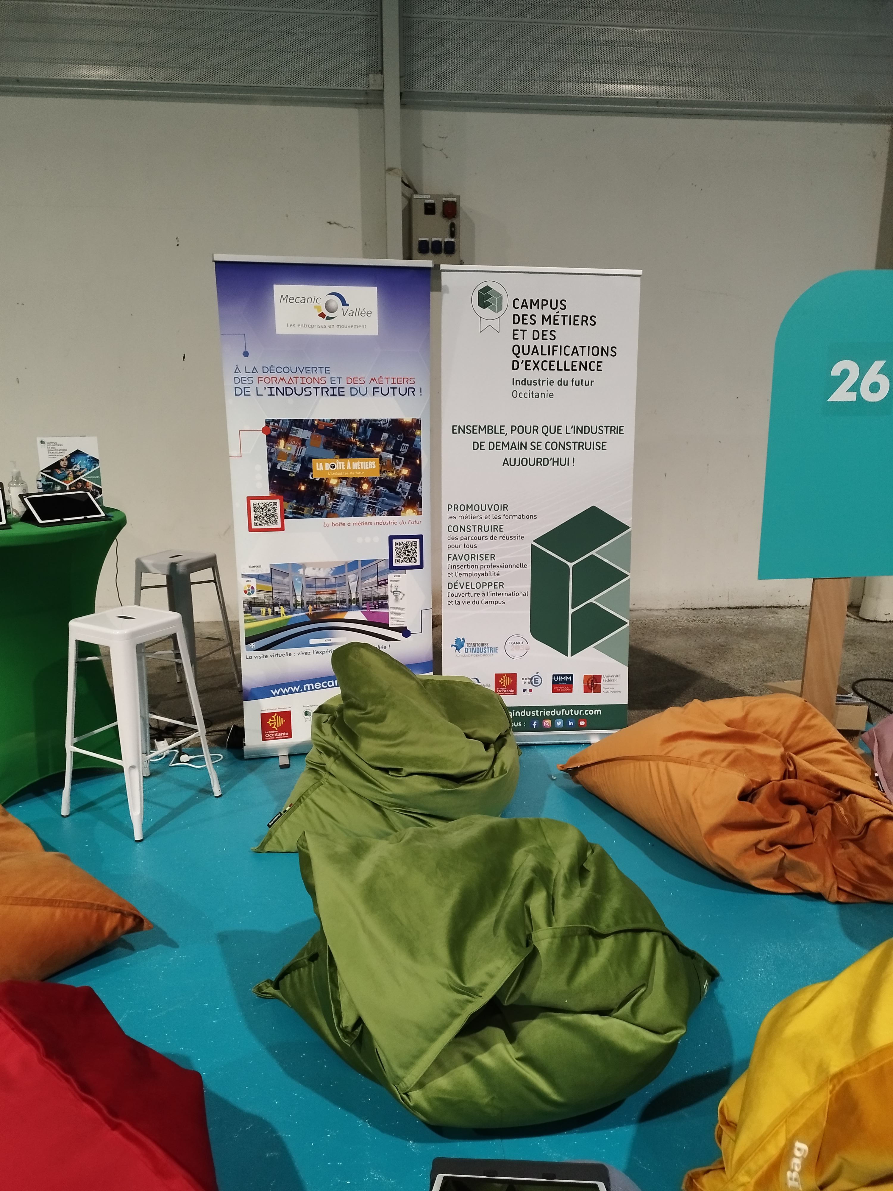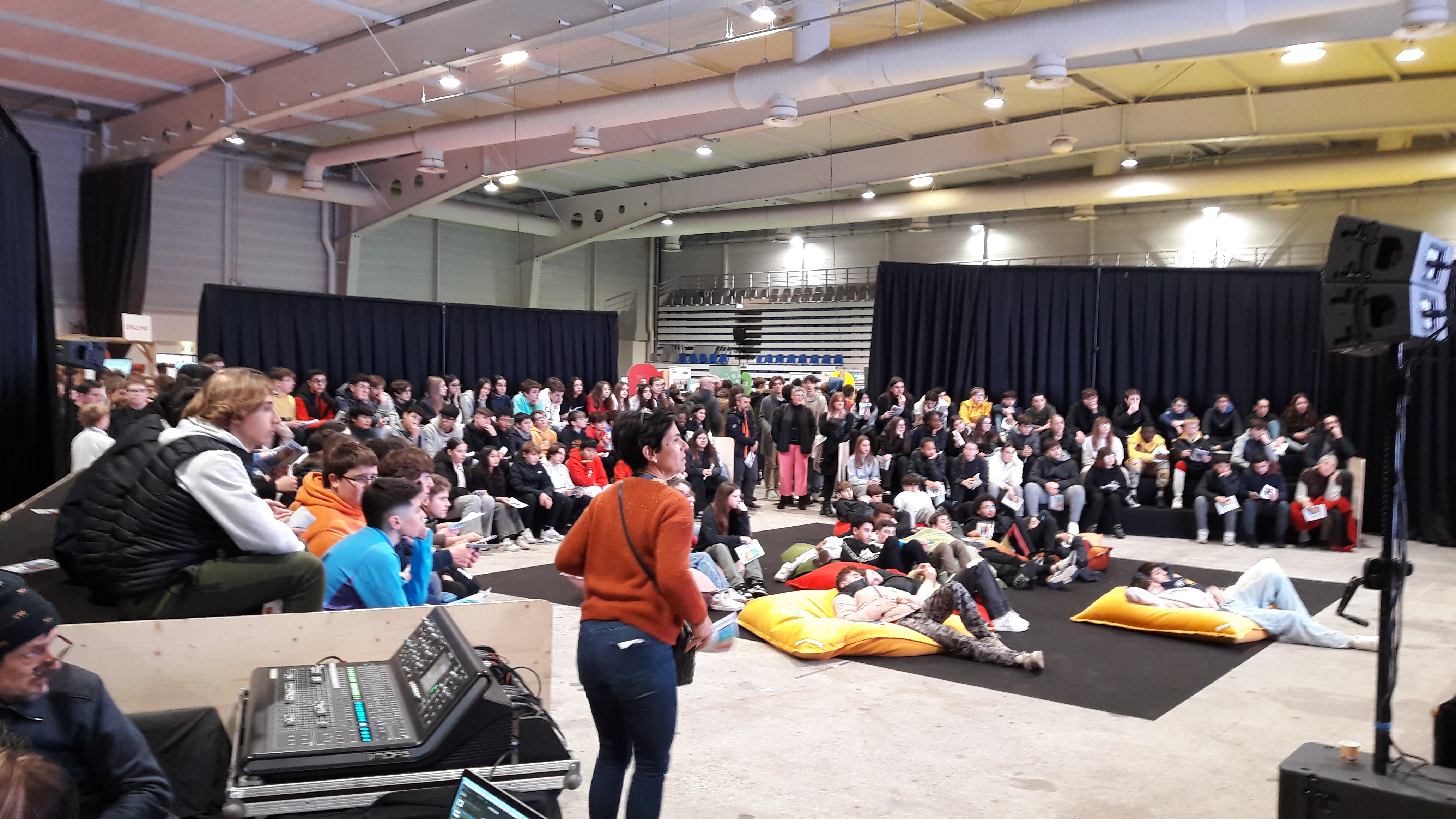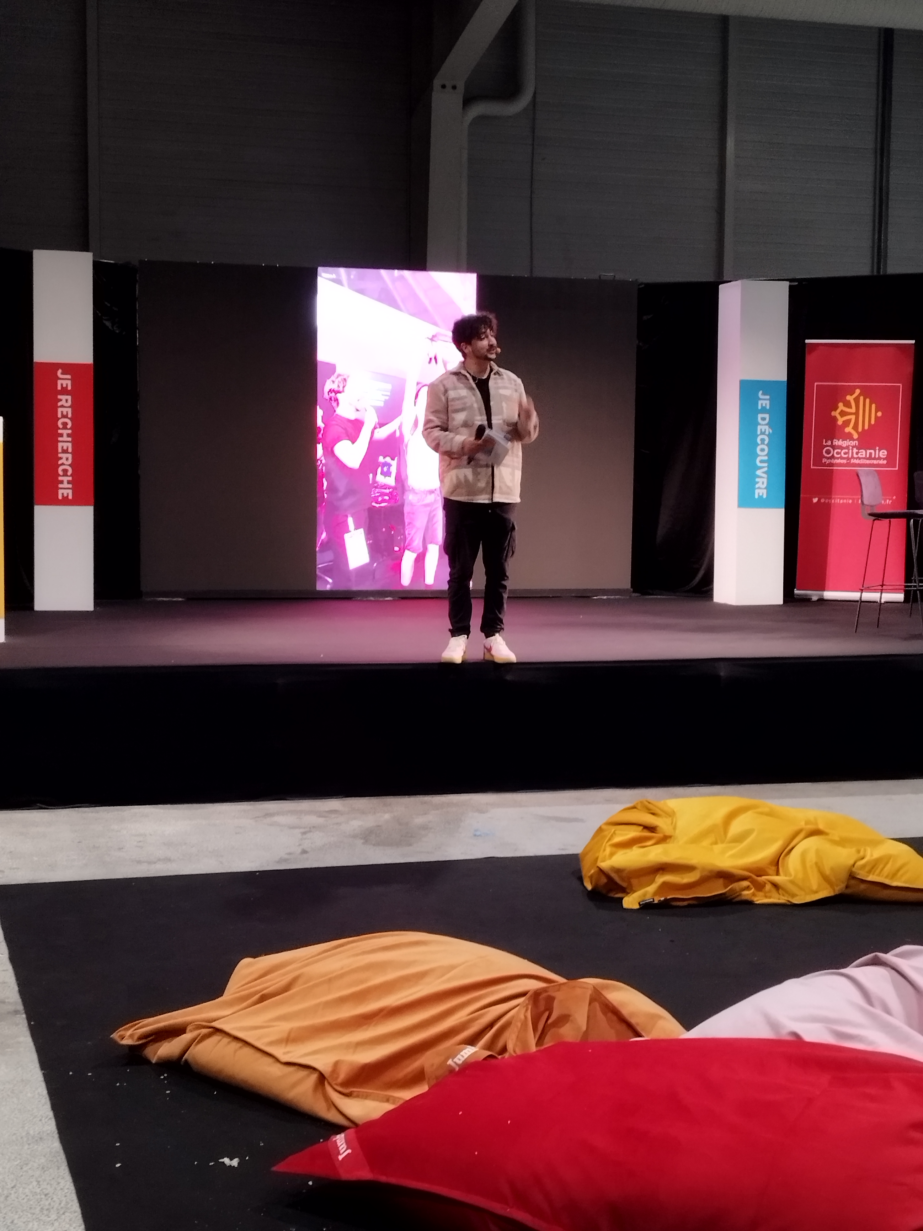 – Maxence, Élias et Enzo : « A l’entrée du salon, des personnes nous ont distribué un livret avec le plan du salon, les numéros des stands et un questionnaire. Puis nous sommes allés dans un mini amphithéâtre pour écouter Co6nus, un streamer sur Twitch. Il a interviewé Fernando Belisario, un réalisateur de film d’animation et professeur d’arts appliqués et de communication marketing. Il nous a raconté son parcours professionnel. Après cette rencontre instructive, nous nous sommes promenés entre les stands. Personnellement, je me suis intéressé aux métiers du paysage et des espaces verts. Puis je suis allé dans le cube de réalité virtuelle et j’ai aussi participé à un atelier de réactivité au stand des métiers de l’animation. » Maxence.