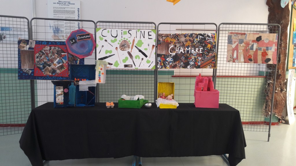 Avant le spectacle, nous avons répété pendant 9 heures sur 4 semaines. Les thèmes étaient la cuisine, le bureau ou la chambre, et la salle de bain. A chacun était attribué une couleur : chaque danseur était habillé dans une couleur différente, et on les a utilisées pour les créations que nous avons réalisées en Arts plastiques avec Mme Léporati.