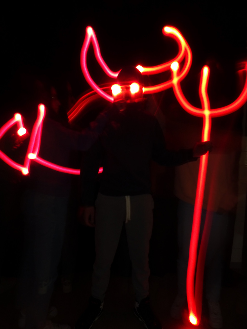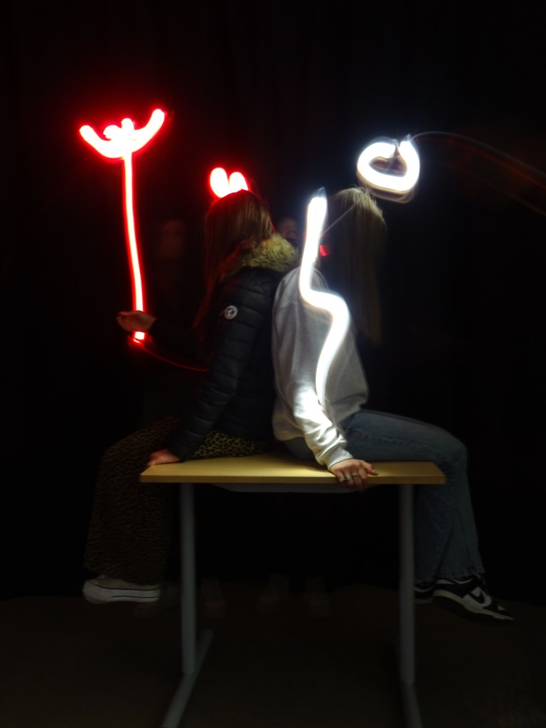 Elle nous a initiés à la technique du « light painting » ce qui veut dire un « dessin produit avec de la lumière ». C’est un art qui se fabrique dans le noir complet ! Une personne prend une photo avec un appareil réglé sur une pose longue pendant qu’une ou plusieurs personnes tracent des formes dans l’air avec une source de lumière ( lampe torche, bougie…). Ainsi, sur la photo, nous ne voyons que les formes tracées par la lumière.