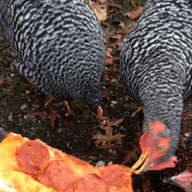 – Maintenant, les poules. Elles passent leurs temps à pondre et manger. Souvent, elles picorent des graines et de temps en temps les restes de nos repas. Quand on va chercher les œufs, elles veulent toutes sortir !