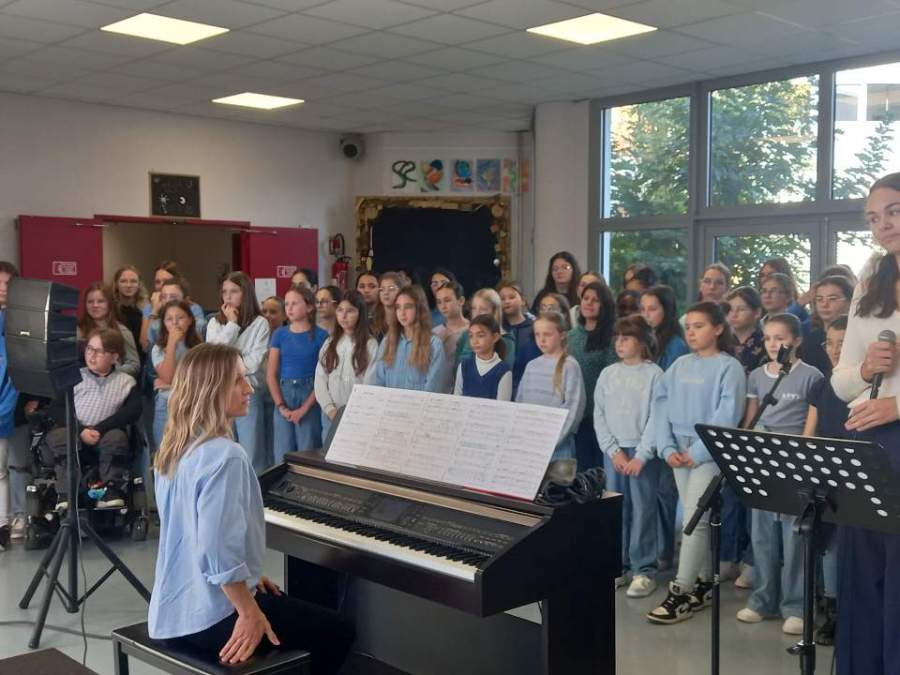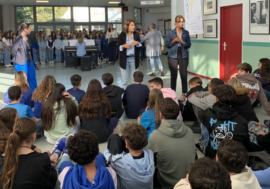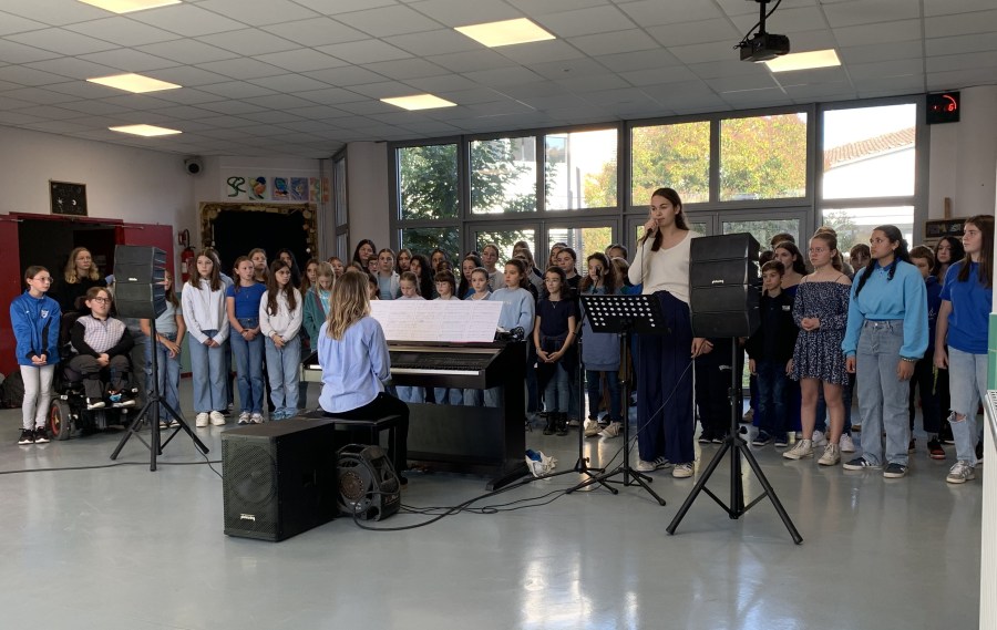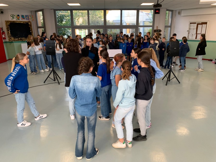 Les classes, par niveaux, sont venues dans le hall du collège pour écouter une chanson magnifique de Maelle, L’effet de masse, interprétée par Callogero d’habitude et chantée pour l’occasion par les choristes du collège dirigés par Mme Corneille. Sur cette chanson, les danseuses de Mme Gaillaguet ont interprété la chorégraphie qu’elles avaient créée pour le spectacle de la fin d’année dernière. C’était très beau, très bien chanté, et très émouvant : certains spectateurs ont même pleuré.