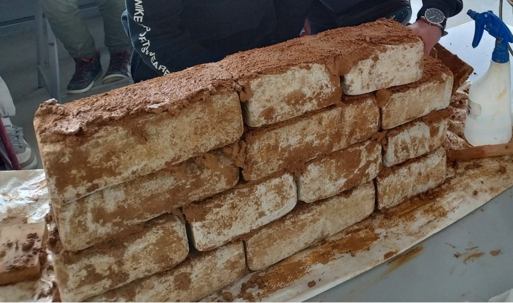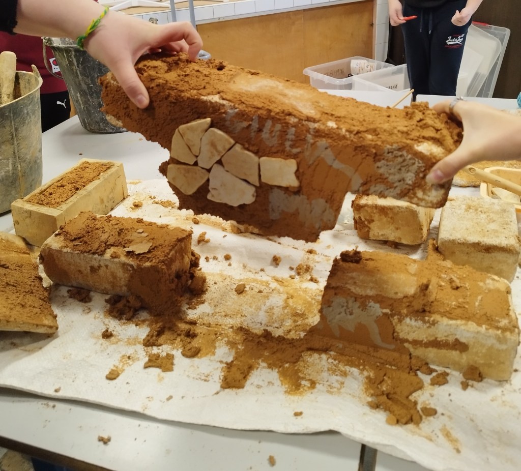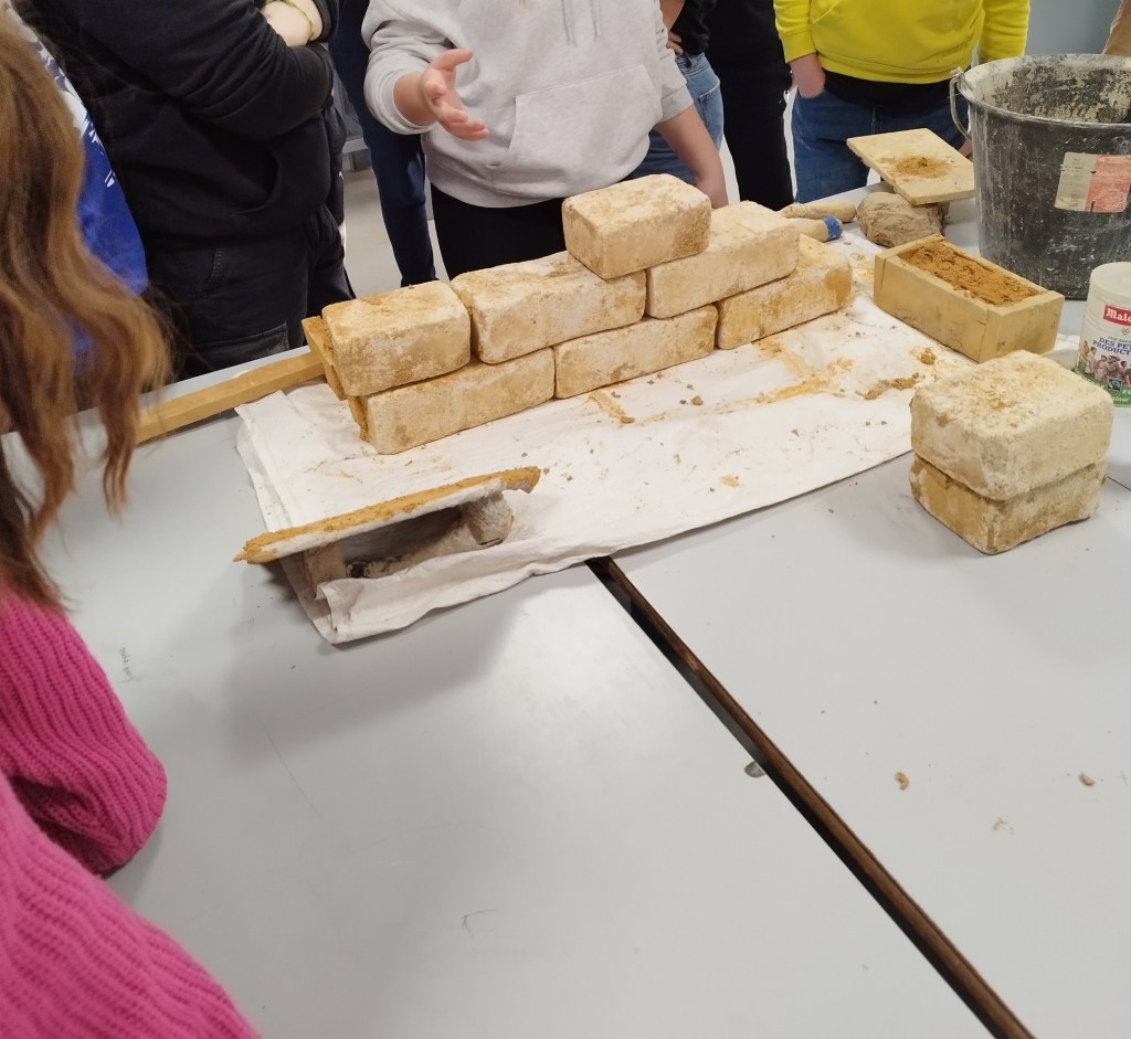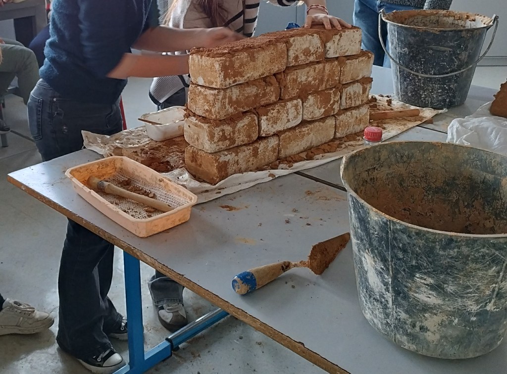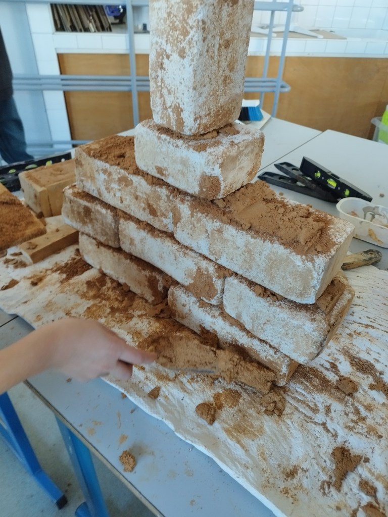 Ensuite M. Schmitt nous a parlé de la technique de « l’adobe » qui consiste à faire un mélange d’eau, de paille et de terre. Ensuite on met le mélange dans un moule à brique, puis on aplatit, on laisse sécher, puis on démoule. On a testé et ça a fonctionné !