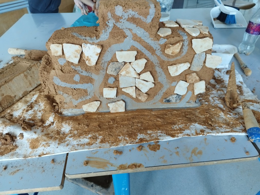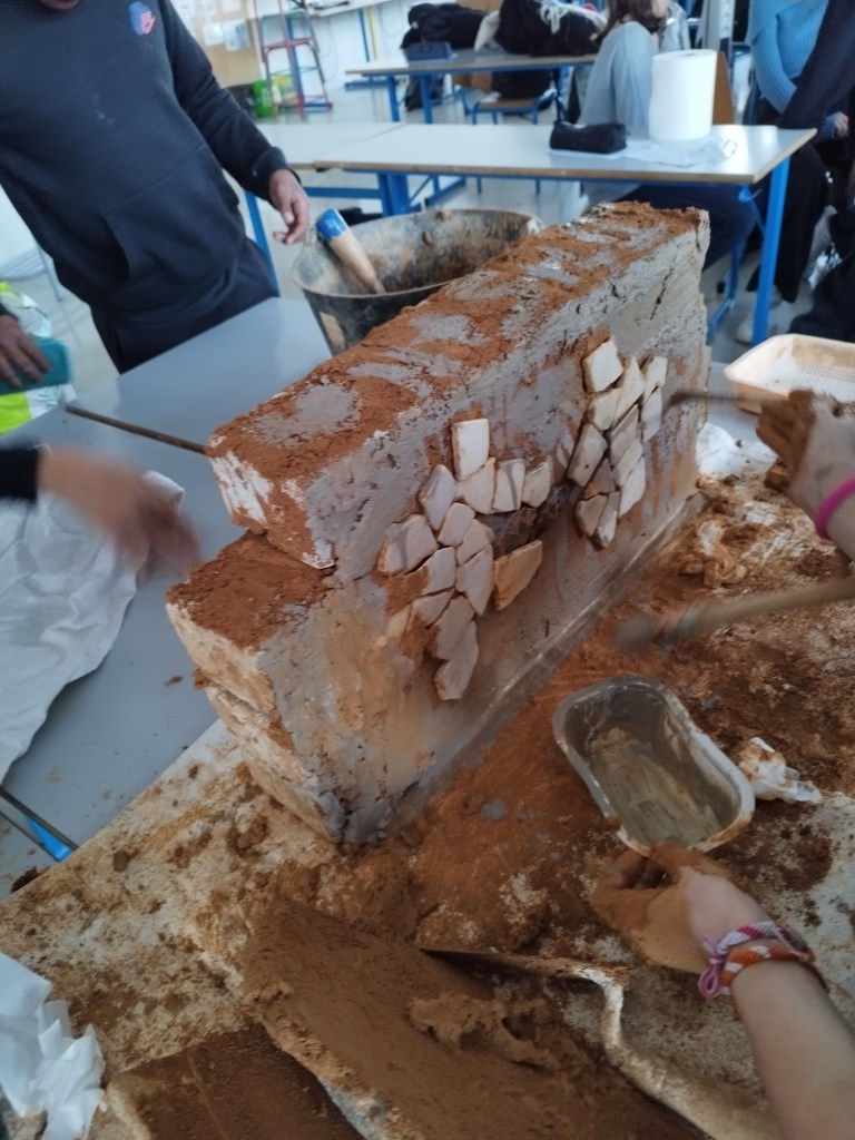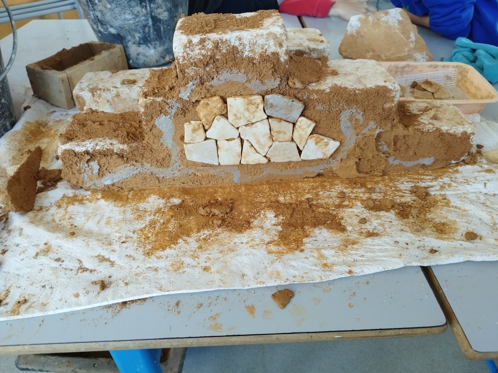 Ensuite on a bâti un muret que l’on a ensuite décoré avec des galets et de la chaux, avec des outils comme la truelle, une gamate (un genre de récipient), une taloche, une spatule et un tasseau.