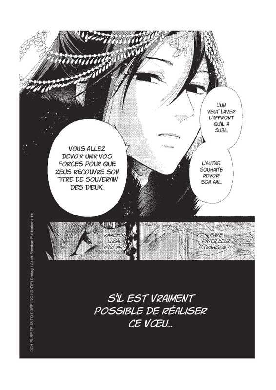 L’histoire de ce manga est juste incroyable. Cela se passe il y a 2500 ans en Grèce. Le héros principal est Tyet, un jeune esclave égyptien. Son maître et son meilleur ami Lugal tombent malades lors d’une épidémie de peste. Pour éviter la propagation de l’épidémie, le cabanon où vit Lugal est brûlé alors qu’il est encore en vie. Tyet se met alors à prier tous les dieux. Hadès le dieu des morts lui apparaît. Il lui apprend que Zeus est réincarné dans son corps ! Zeus a en effet été condamné par ses propres enfants à être emprisonné dans le corps d’êtres humains pour protéger le monde de sa conduite tyrannique et arrogante. Hadès passe alors un marché avec Tyet : pour sauver son ami, il devra aider Zeus à retrouver ses pouvoirs…