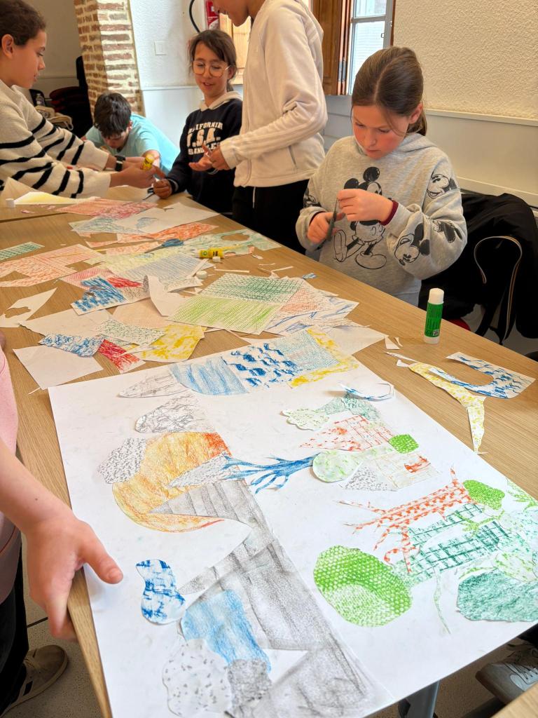 Puis nous avons formé 3 groupes de 6 ou de 7 et Kam nous a donné une grande feuille par groupe. Tous ensemble nous avons dû nous mettre d’accord sur un thème et réaliser un collage à partir de nos traces, dans lesquelles nous avons découpé des formes.