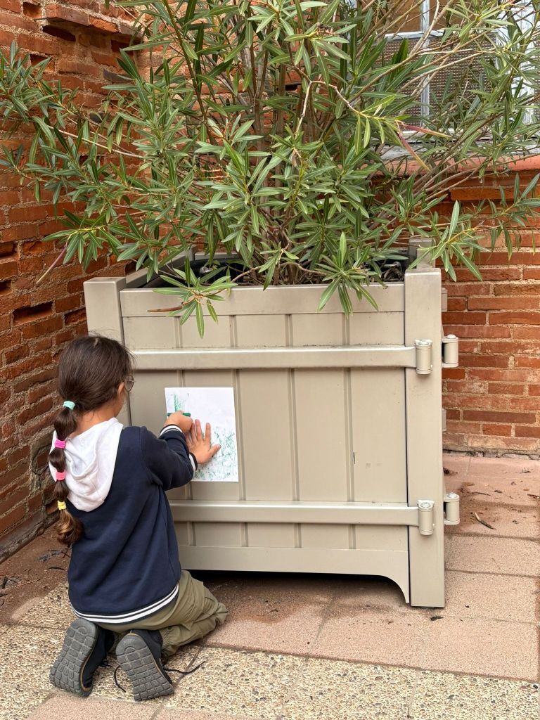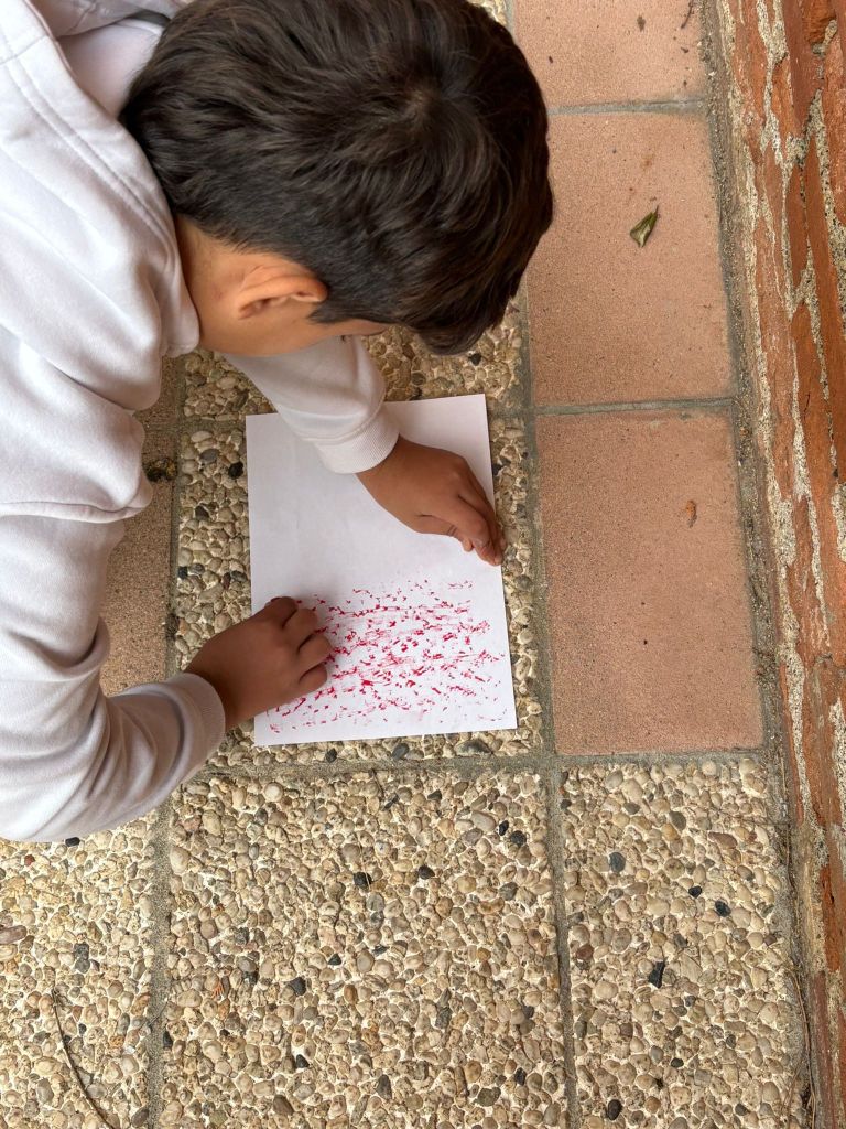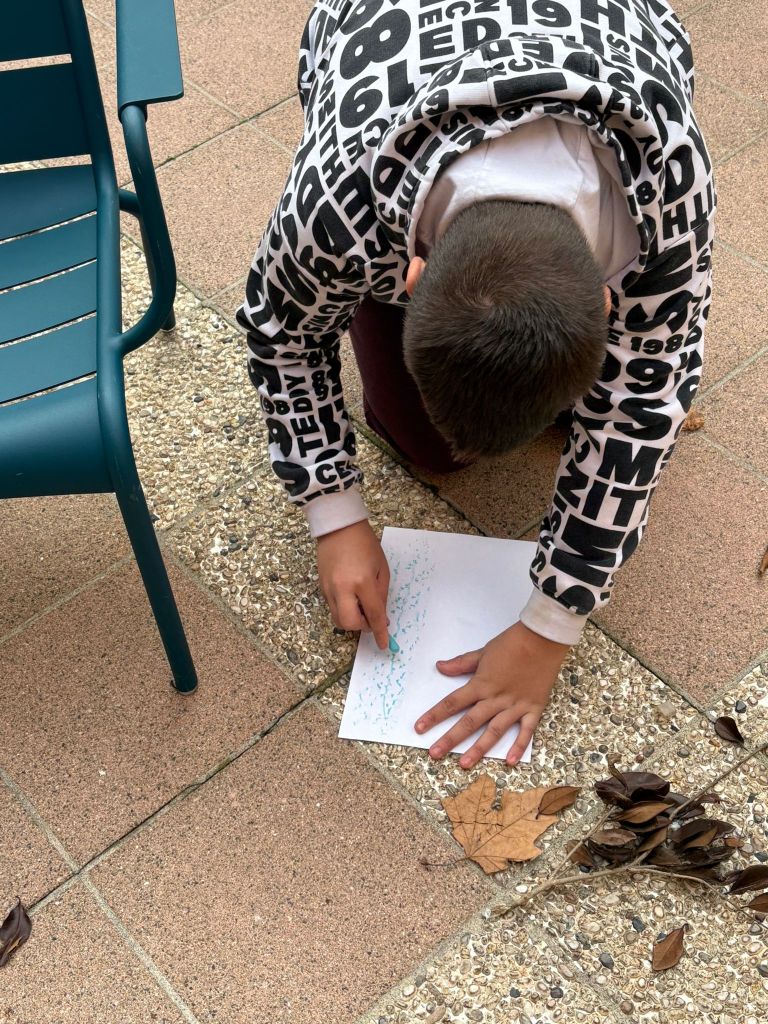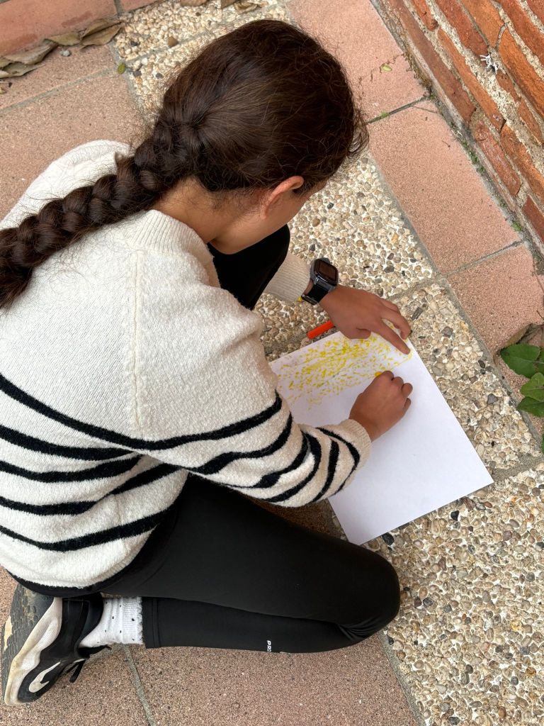 Ensuite, l’atelier a commencé. Nous avons récolté des traces (des empreintes) en plaquant notre feuille sur des matières trouvées dans la pièce où nous étions et dans la cour et en passant des craies grasses dessus.
