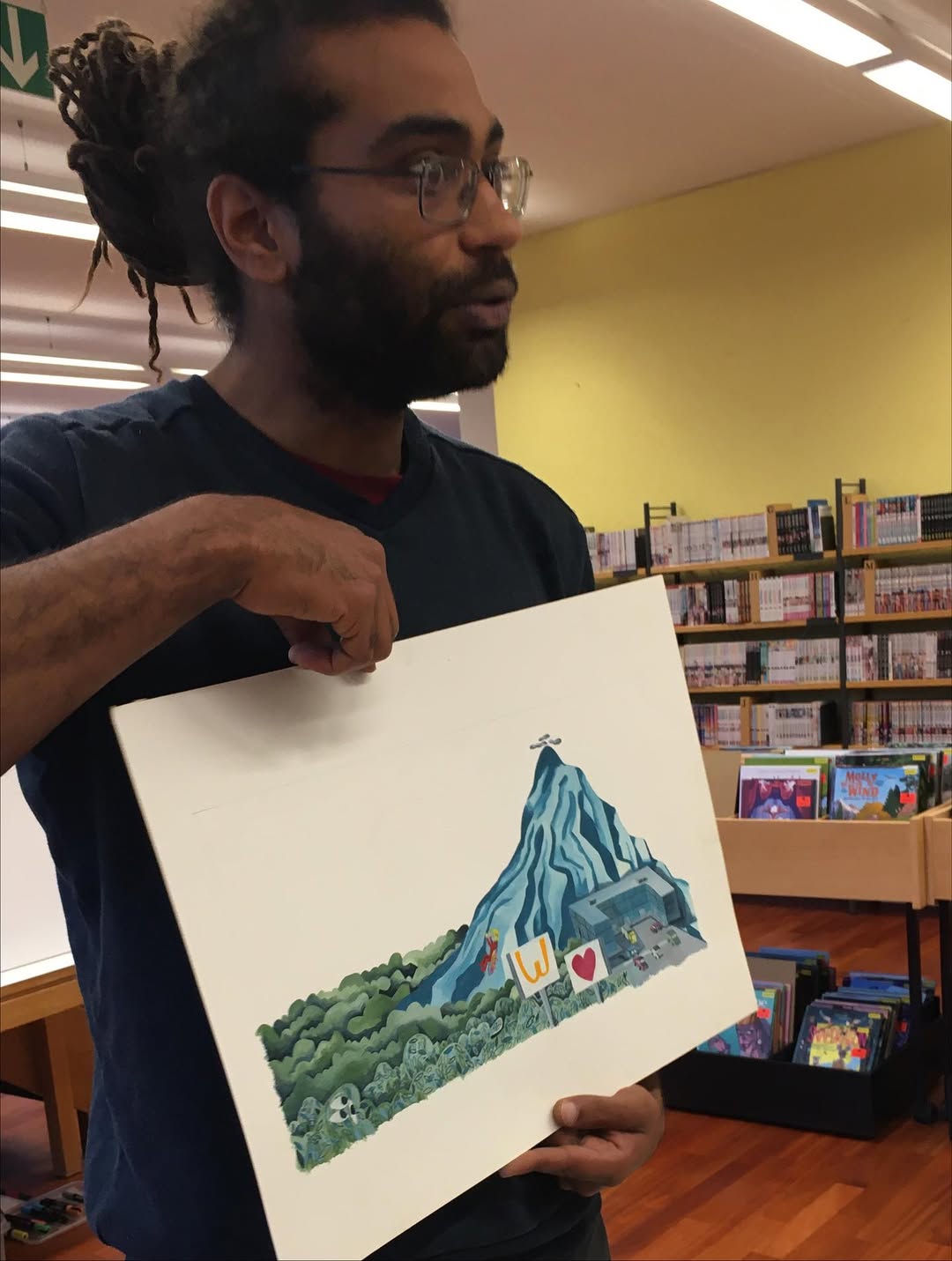 Dans un premier temps, nous lui avons posé des questions sur son travail et il nous a montré les livres qu’il a illustrés, comme Pouce, Les Lettres du rêve, La Kahute ou encore Amour bleu. Il nous a même montré des originaux, des planches du storyboard (une sorte de brouillon) de l’album Pouce.