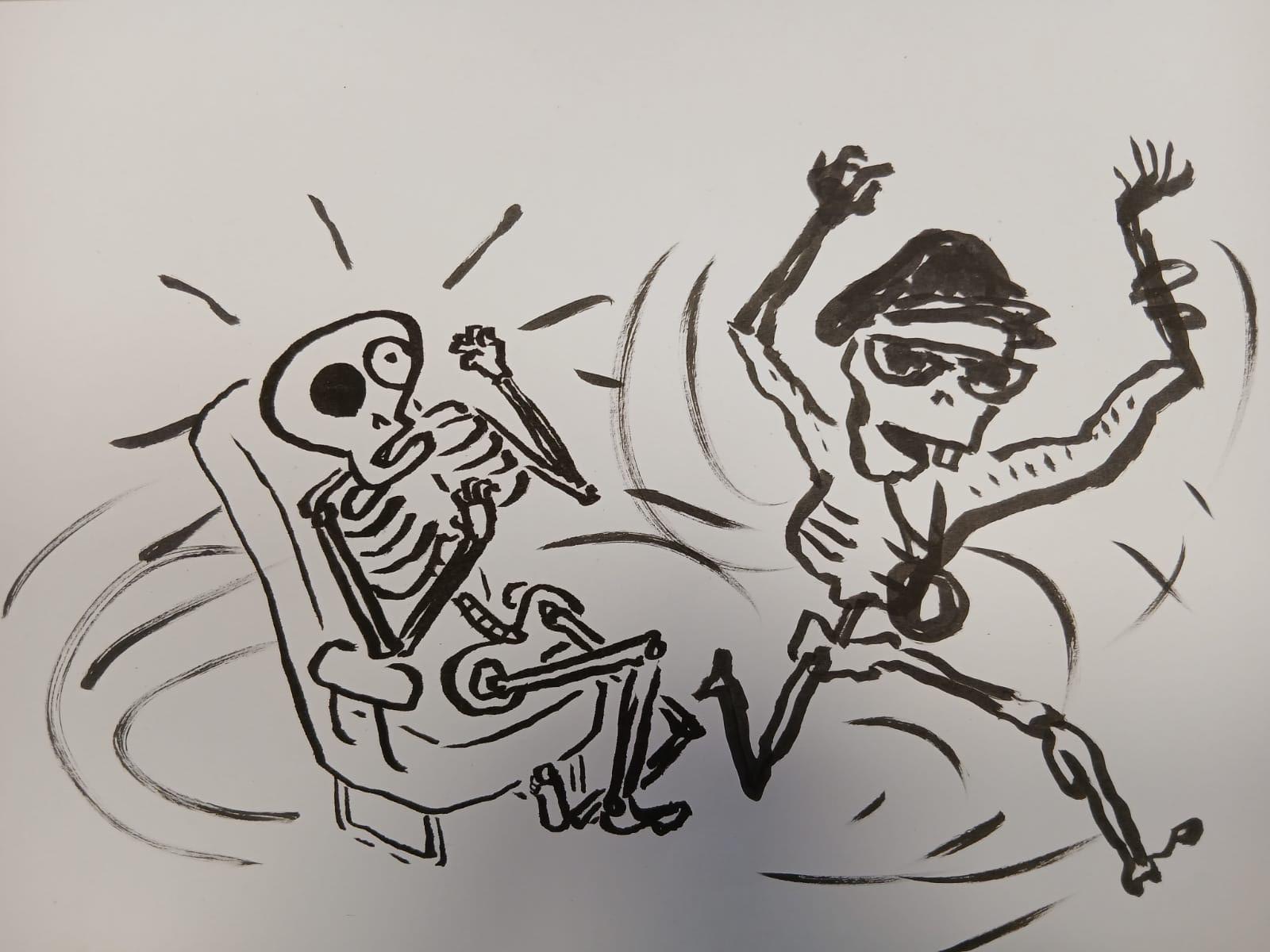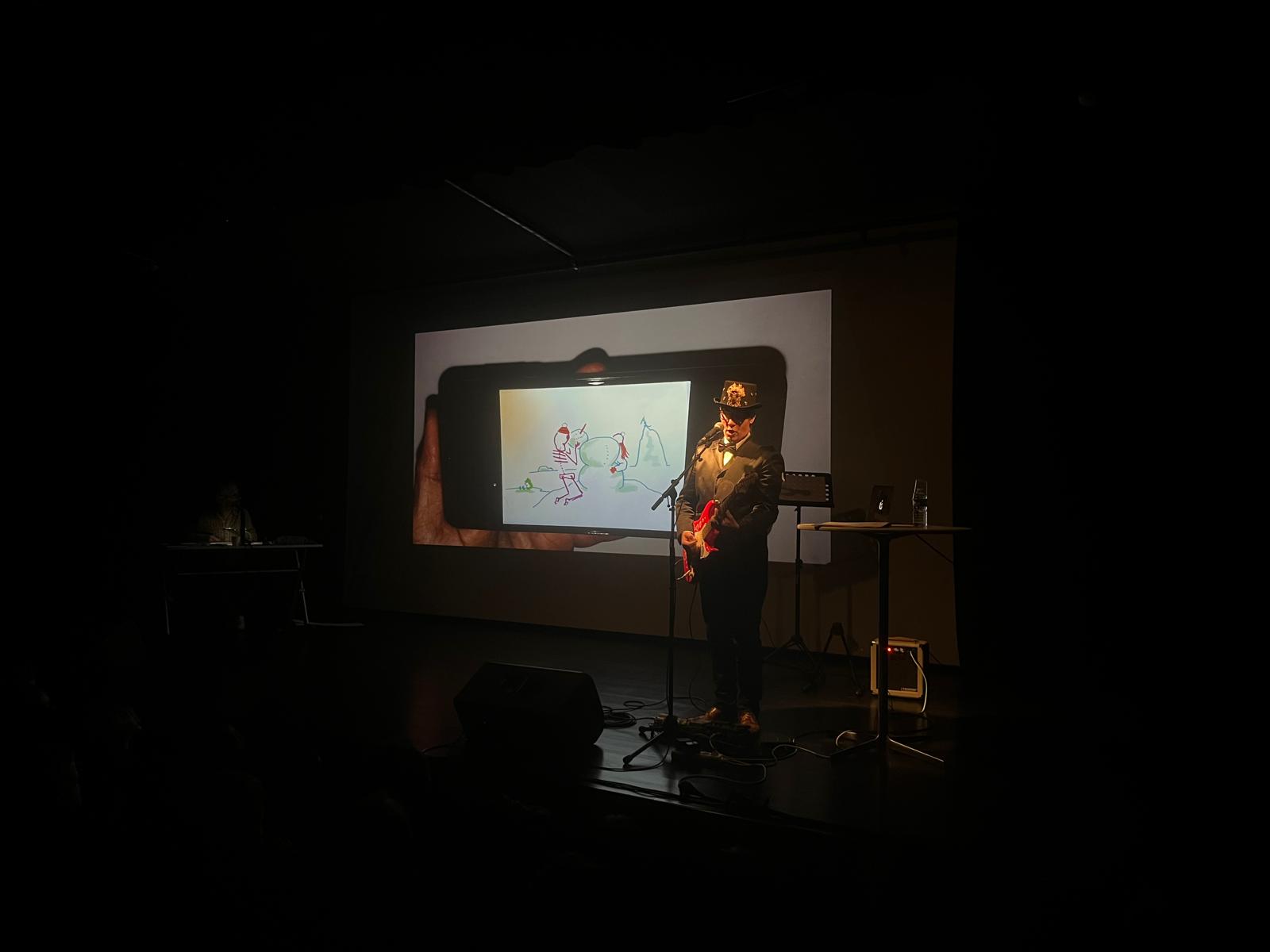 Dans le cadre du festival Lettres d’automne, le jeudi 27 novembre de 13h30 à 16h00, avec l’école primaire de St Étienne de Tulmont et des 6A et 6B, nous sommes allés à la Mémo (la médiathèque de Montauban), pour aller voir le spectacle Skeletos de Gaëtan Doremus et Denis Baronnet : le premier dessinait et l’autre racontait et jouait de la musique.