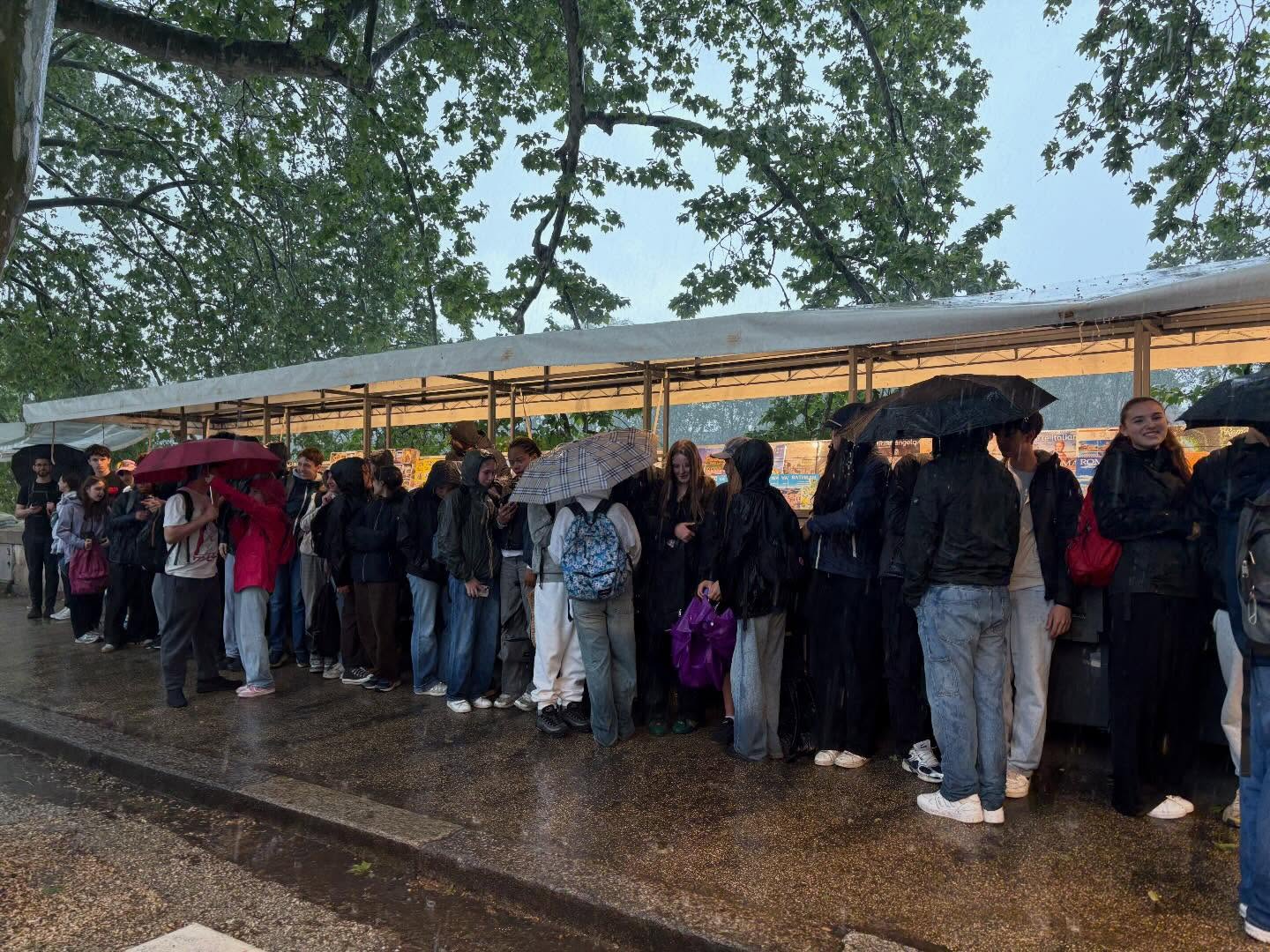 Malheureusement, notre quota de chance a dû s’en retrouver épuisé puisque le ciel a par la suite décidé qu’il était temps de nous noyer. Nous nous sommes donc retrouvés piégés par un rideau de pluie bien plus épais que notre motivation à le traverser, et avons patienté un moment sous un abri de fortune.